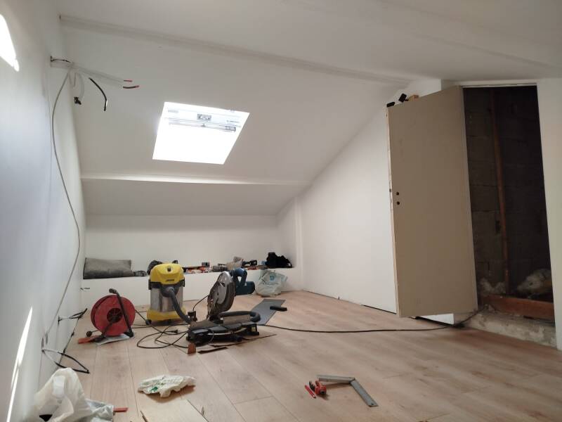 (Démolition plafond, création d'un plancher bois. Réalisation électricité, isolation, faux plafond rampant, peinture et pose de vélux et parquet).